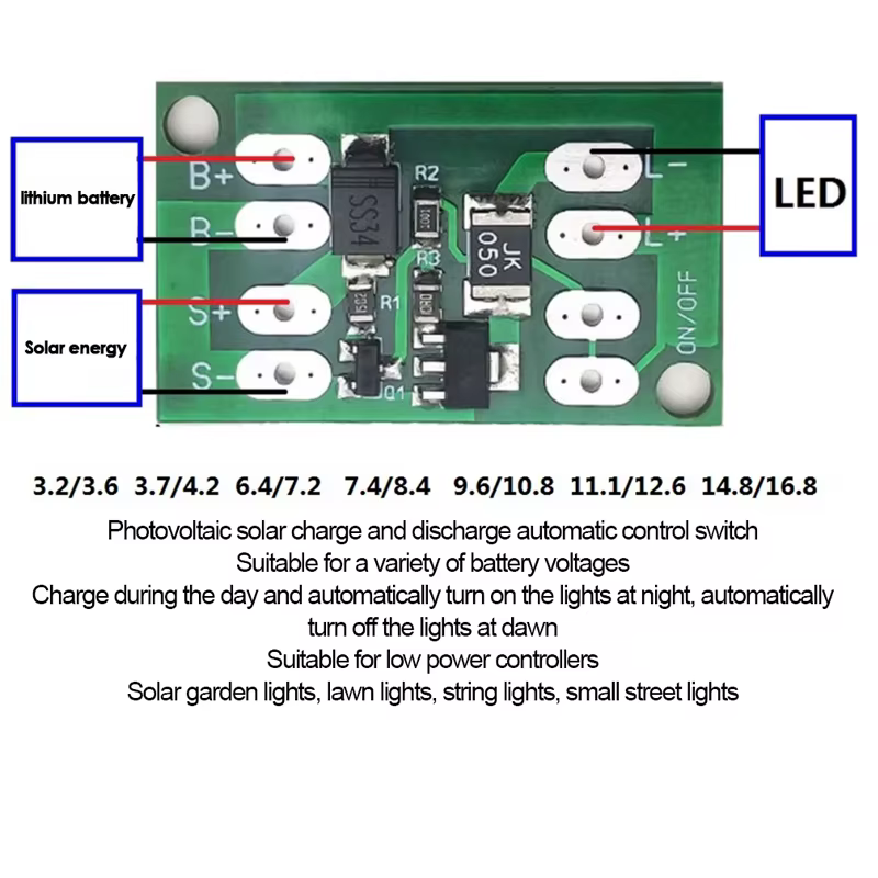 5. The low-power controller is suitable for solar garden lights, lawn lights, colorful string lights, small street lights, etc.